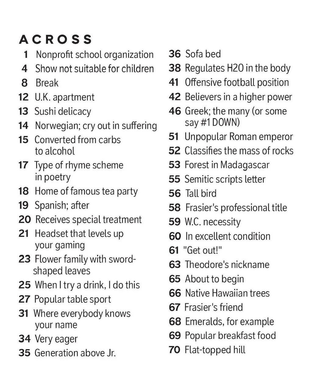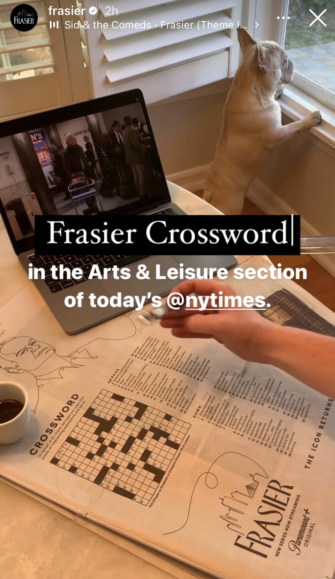 To celebrate the new series and welcome Dr. Crane back to Boston, we created a full-page crossword featured in the 10/15/2023 issue of The New York Times. Later that week, we revealed the answer key on the official Frasier Instagram account so all the fans playing along could check their work.